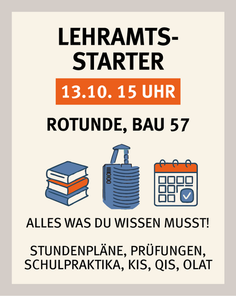 Tipps zu Stundenplan, Prüfungen und Schulpraktika. Einführung in QIS, KIS und OLAT. Gelegenheit zum Austausch und Kennenlernen.