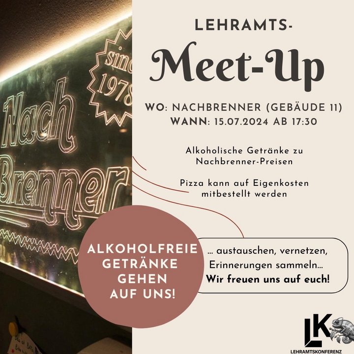 am 15.07.2024 veranstalten wir ab 17:30 Uhr im Nachbrenner (Gebäude 11) ein Lehramts Meet-Up, zu welchem ihr alle herzlich eingeladen seid. Wir wollen euch kennenlernen und euch die Chance geben, dass ihr euch bei einer Runde Tischkicker,  Musik und Getränken kennenlernt.